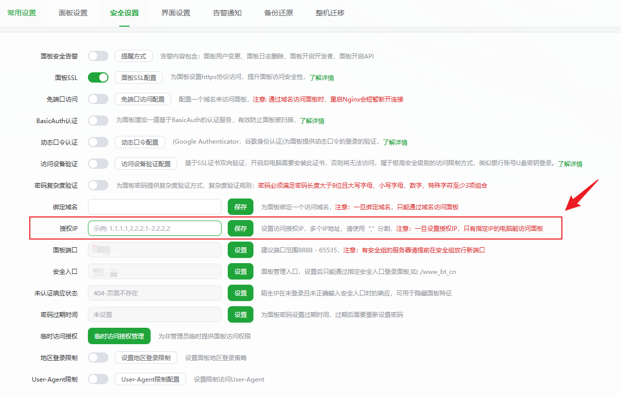 面板设置 → 授权 IP